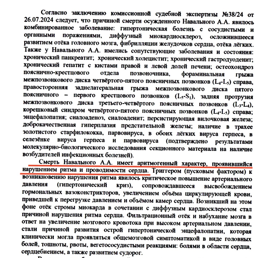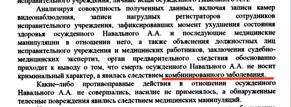 Следующая страница постановления: диагноз. Самое, наверное, важное. Помните, как пропаганда изголялась и кривлялась придумывая диагнозы с первой минуты. Сразу стали писать про тромб и многие до сих пор это повторяют. Так вот, нет никакого тромба. Вообще. Написано, что причиной смерти является некое комбинированное заболевание, состоящее из десятка разных — от холецистита до межпозвоночной грыжи и золотистого стафилококка.