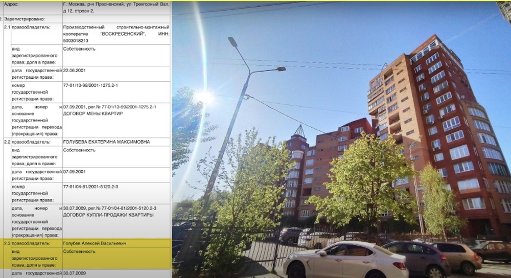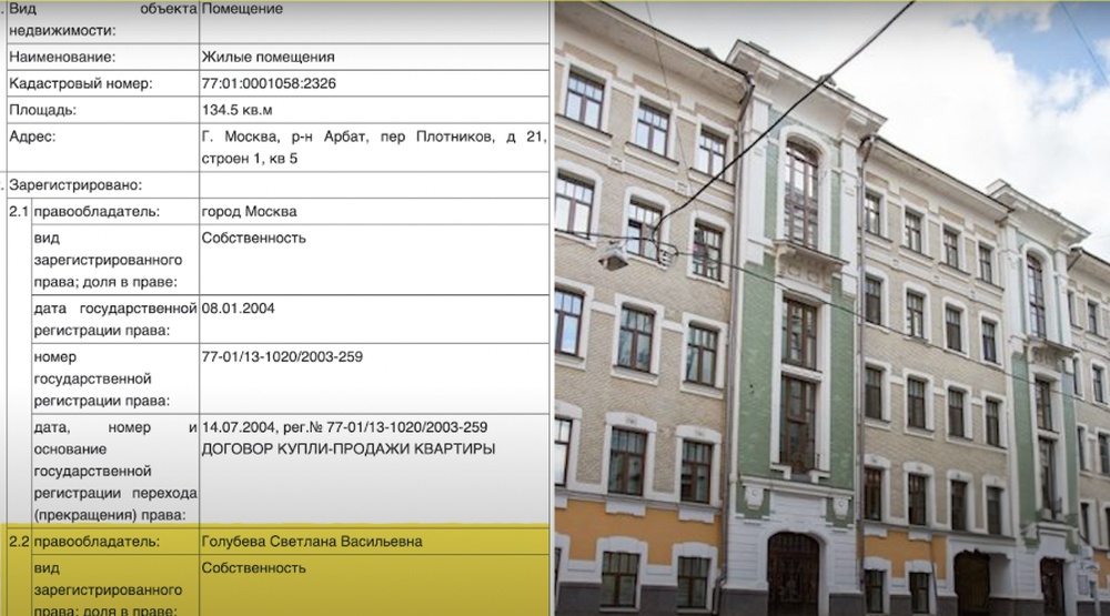 И у дочери Голубева, Светланы, дела идут не хуже — у нее в собственности две квартиры в центре Москвы. Первая — 170 квадратов на Мосфильмовской улице, а вторая — 135 квадратных метров на Арбате, в Плотниковом переулке. Сейчас стоимость этой жилой недвижимости составляет 200 млн рублей. Всего недвижимости мы нашли у них на почти полтора миллиарда рублей.