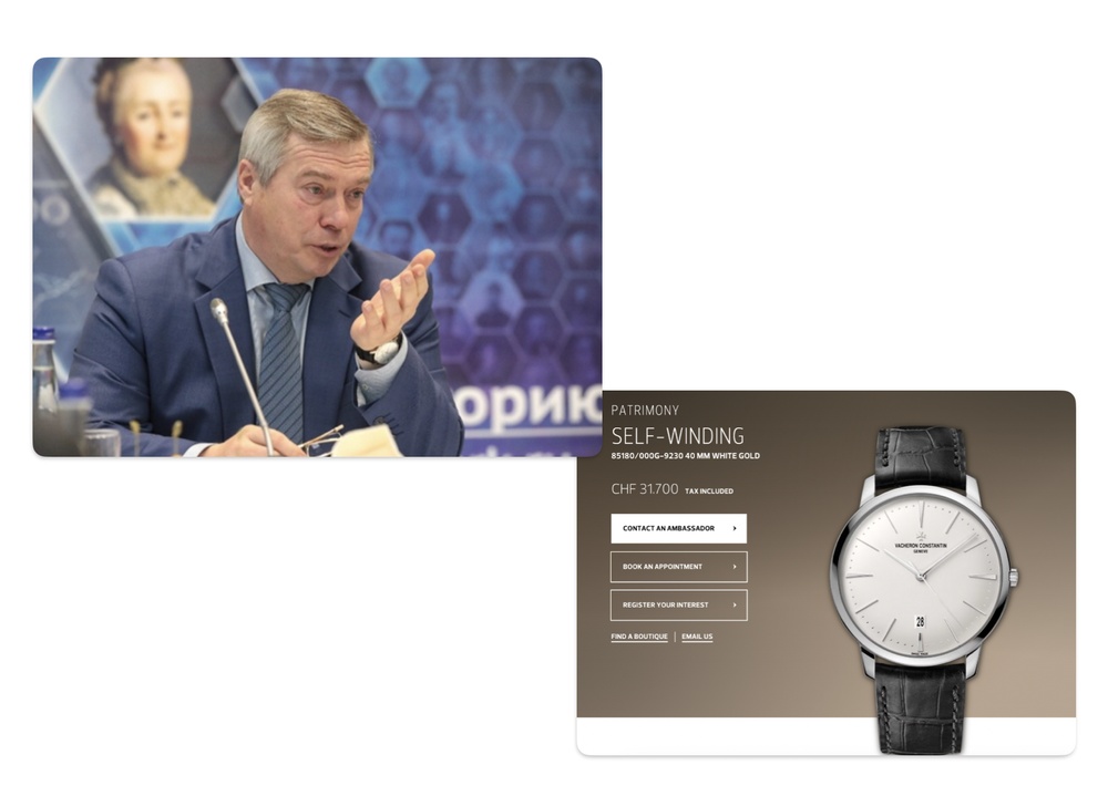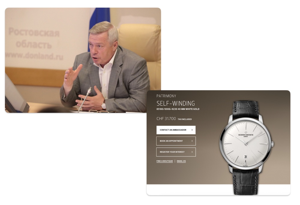 Второй обязательный элемент путинского жулика-единоросса: люди вокруг тебя в любую минуту должны точно понимать, насколько ты богат и статусен. Для этого нужна внушительная коллекция часов. Такая коллекция у Голубева есть. Губернатор области любил красоваться в часах за полтора миллиона.