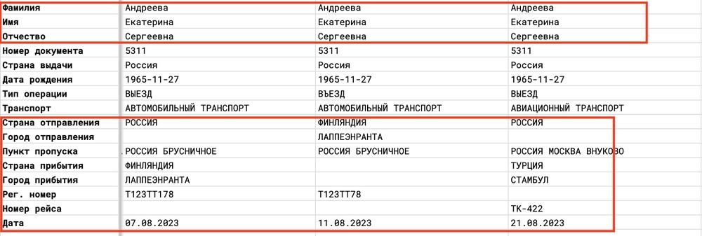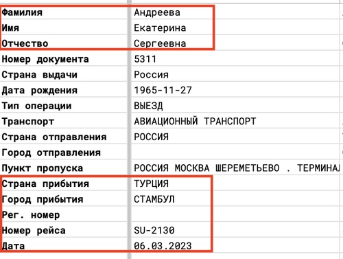 Затем мы взяли все данные о её перелётах и совместили их с графиком работы. Результат говорит сам за себя: как только её недельная смена заканчивается, Андреева сразу же уезжает из России и от Путина, при котором вроде бы в России не жизнь, а благодать. Давайте на конкретных примерах, возьмём данные за первые шесть месяцев 2023 года.