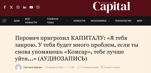 Также Перовича обвиняют в коррупции: он выступал посредником в сделке между правительством Республики Сербской и влиятельным российским миллиардером. При этом, будучи де-факто чиновником, он одновременно работал в двух компаниях, принадлежавших этому миллиардеру, и владел акциями в одном из его офшоров. В американских санкциях имя напрямую не указано, но, скорее всего, речь идёт о российском олигархе Рашиде Сардарове.