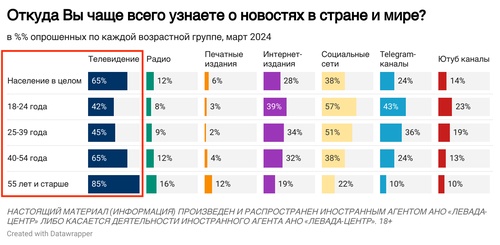 Более 40% россиян моложе 40 лет узнают новости из телевизора, после 40 лет телевизионные новости смотрят уже 65% наших сограждан. К 55-летнему возрасту для 85% россиян именно телевизор становится единственным источником информации о том, что происходит в стране и мире. Многие из них смотрят выпуски новостей каждый день или по несколько раз в день.