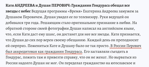 На этот раз гражданство у Андреевой появилось не за заслуги перед Гондурасом. Она получила его благодаря супругу — Душко Перовичу, о наличии у него гражданства этой страны писали еще в 2004 году.