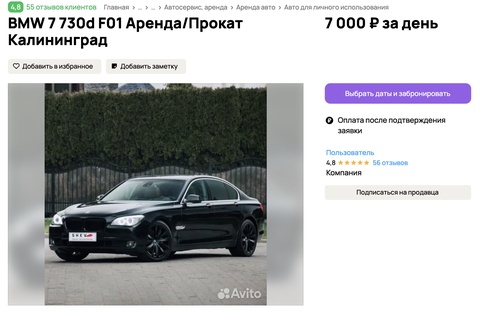 Какую-то совсем топорную и бессовестную схему Перович проворачивает с арендой автомобиля. Вот, например, BMW 7-ой серии, 2008 года выпуска, то есть 17-летняя. Сейчас такую можно легко купить за 1,4 млн.