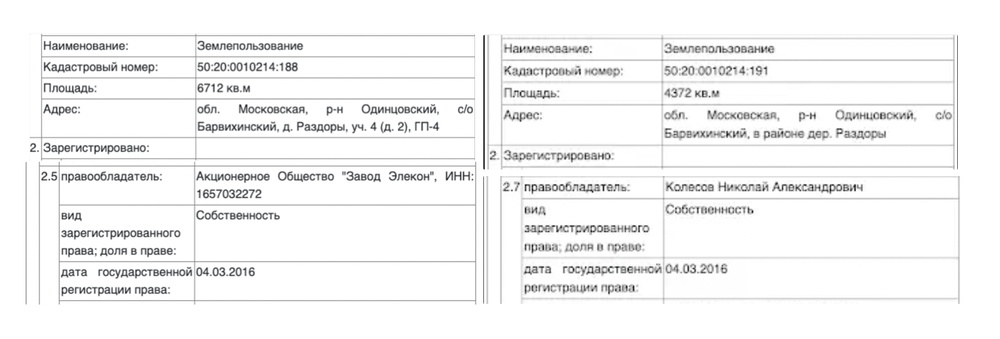 Участок оформлен причудливо: часть на самого Колесова, часть на завод Элекон.