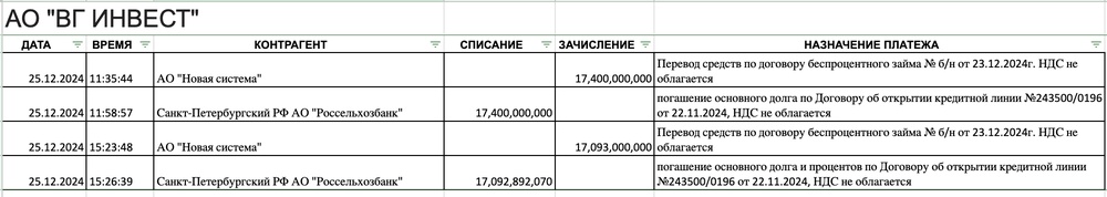 25 декабря на счет «ВГ Инвет» поступает 34 млрд рублей от АО «Новая система». Это следующее звено. И именно этими деньгами в течение нескольких минут они выплачивают кредит Россельхозбанку.