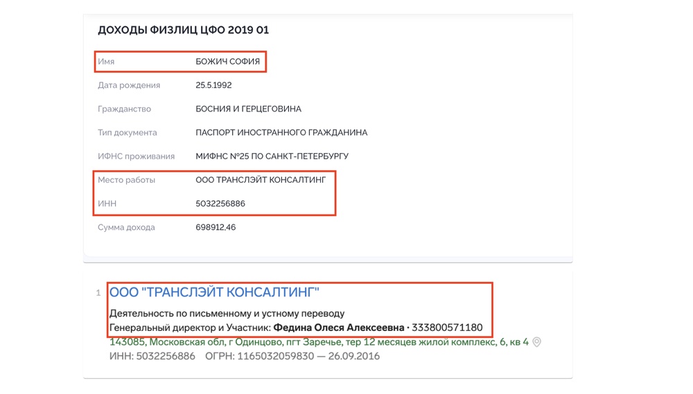 Ну и в качестве третьего примера давайте обратим внимание на сотрудников «Эна Инвест» — тех людей, которые получают там зарплату. Благо, кроме директора и бухгалтера, их там всего двое. Это очень интересные персонажи — иностранки: одну зовут София Божич, ей 33 года, она боснийка.