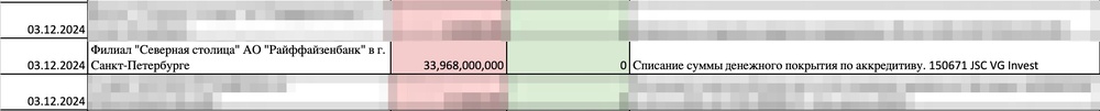 Это кредит, который выдал никому неизвестной, ничем не владеющей, только что созданной фирме государственный Россельхозбанк. В этот же день эти 34 миллиарда рублей они переводят в другой иностранный банк, чтобы оплатить ими покупку «Балтики». Описание платежа: «Списание суммы денежного покрытия по аккредитиву». Если упростить, это значит что банк здесь выступает просто посредником, и эти деньги будут переведены продавцу, как только условия сделки будут выполнены.