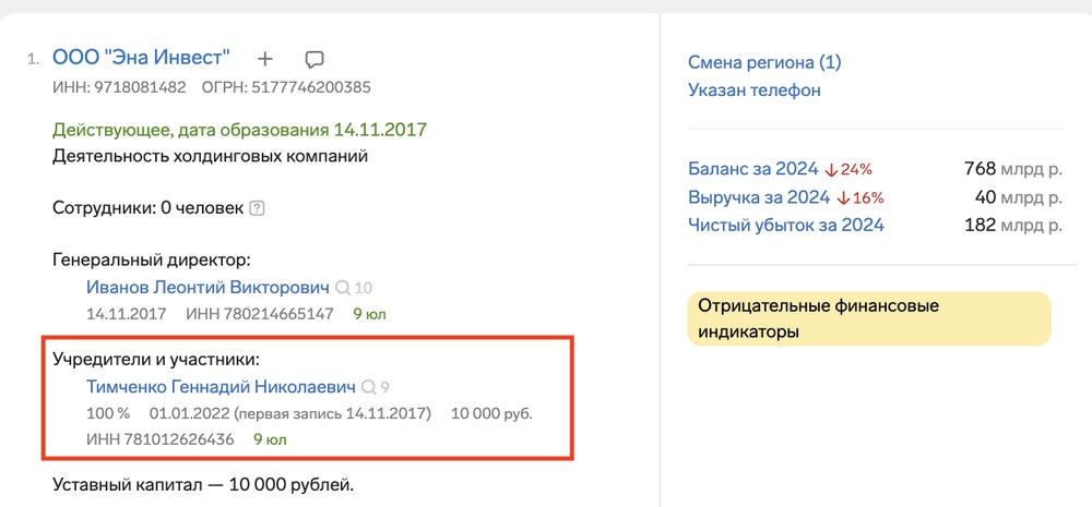 Мы подобрались к финальному звену, потому что «Эна Инвест» на 100% принадлежит прекрасно знакомому вам человеку — Геннадию Тимченко.