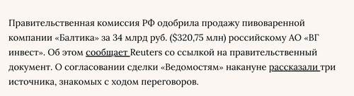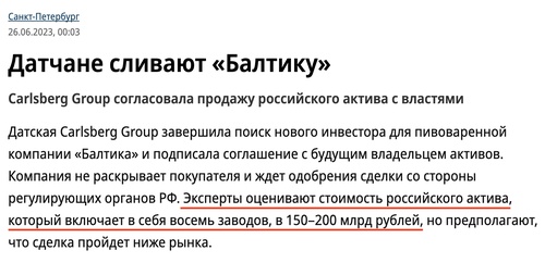 В этот день, 3 декабря 2024 года, как мы знаем из новостей, Карлсберг продал «Балтику», ровно за эту сумму.