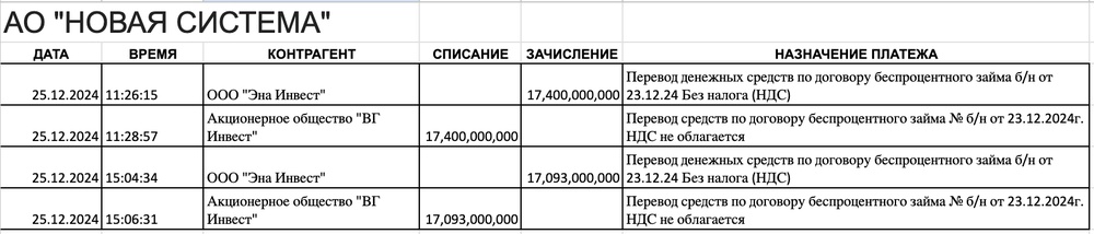Открываем их банковские проводки «Новая Системы» и видим, что за 2 минуты (!) до того, как они отправили эту гигантскую сумму «ВГ Инвесту», они их получили в виде беспроцентного займа от еще одной фирмы из Санкт-Петербурга — «Эна Инвест».