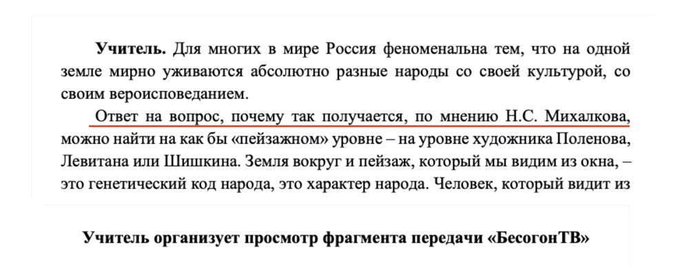 В определенный момент учитель говорит: «Для многих в мире Россия феноменальна тем, что на одной земле мирно уживаются абсолютно разные народы со своей культурой, со своим вероисповеданием». А дальше почему-то преподаватель должен рассказать, что на эту тему думает Н.С. Михалков. Затем (тут никакой дискуссии с учениками прописано) учитель включает телевизор и показывает детям фрагмент передачи «Бесогон».