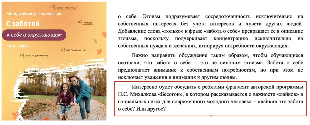 Смотрим еще одну методичку: следующий Разговор о важном, на обложке золотая осень и почему-то коллективизм, тема — с заботой к себе и окружающих. Снова учитель говорит, что нужно посмотреть отрывок из передачи Михалкова... и включает кусочек выпуска «Бесогона» десятилетней давности.